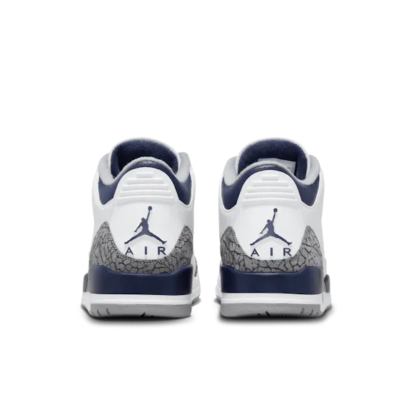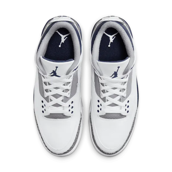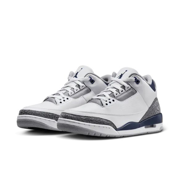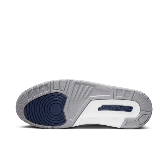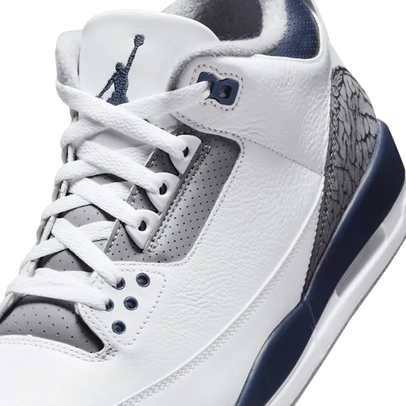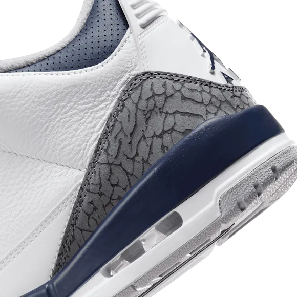 Clean and supreme, the legendary Tinker Hatfield AJ3 design that solidified MJ's place in sneaker lore returns. Taking color-blocking cues from a heritage AJ3 colorway, this edition swaps in Midnight Navy against a White and Cement Grey backdrop. Luxe materials and our signature elephant print elevate every step.