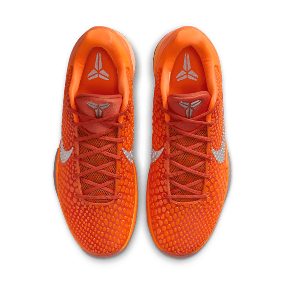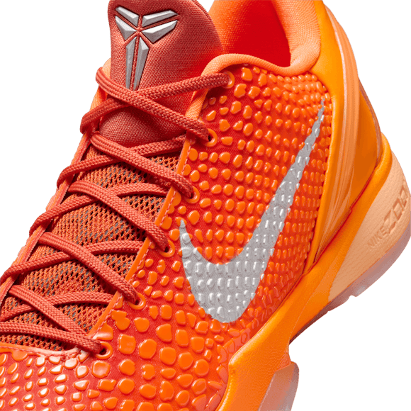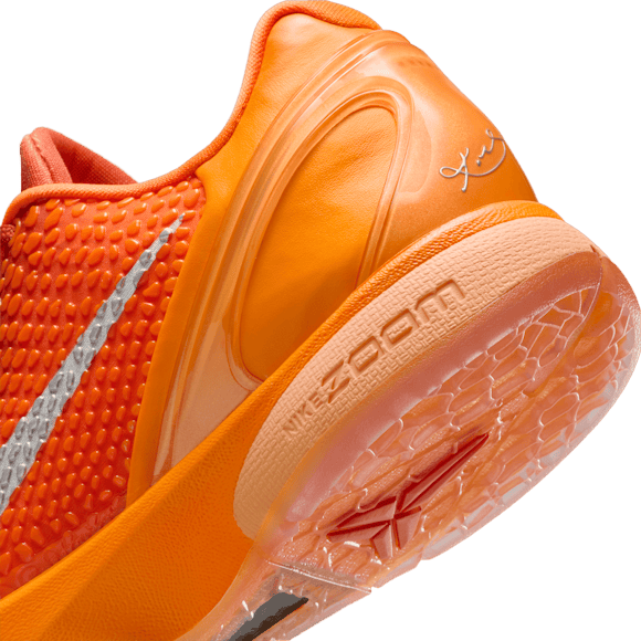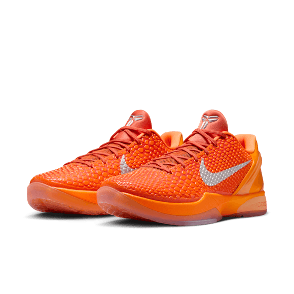 Debuting in 2011, the Kobe 6’s lightweight and low-top design kept up with Kobe’s demanding style of play. This Protro version upgrades the original with Cushlon foam to help keep you fresh for four quarters. And, of course, we couldn't leave out the snakeskin-like print that made the 6 famous.Forefoot Air Zoom unit provides soft, responsive cushioning.Cushlon foam through the midsole gives you a plush feel underfoot that transitions smoothly from heel to toe.Less rubber on the outsole compared to the original Kobe 6 helps enable low-to-the-ground contact while cutting down on weight. Total Orange/Metallic Silver-Cosmic Clay IH1871-800