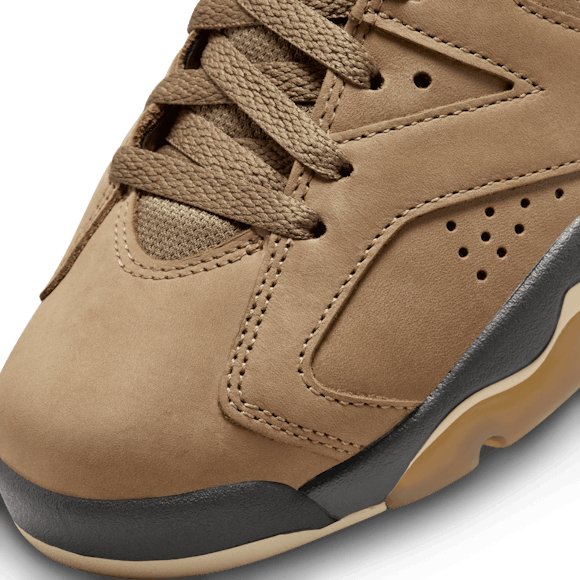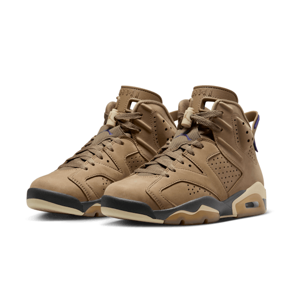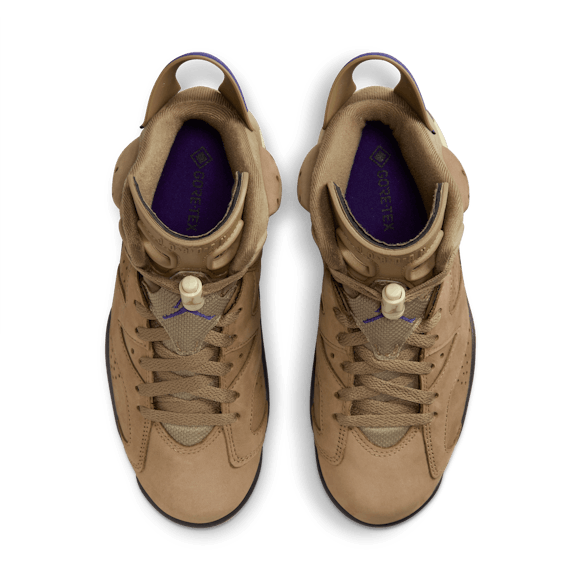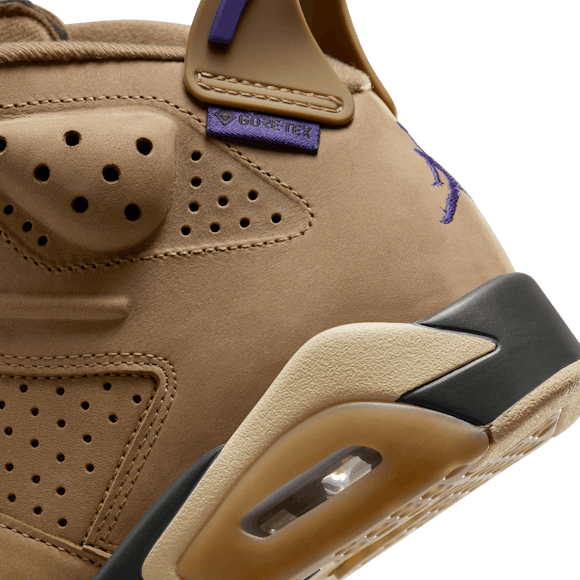 Rain or shine, it's time to continue the championship legacy of the AJ6. This rendition features a waterproof GORE-TEX treatment so you can rock your J's all year long. Premium Brown Kelp leather adds seasonal style while the signature cut-away tongue and heel-pull nod back to the original. For the big finish, Court Purple accents highlight that iconic Jumpman branding. With shoes this good, there's no such thing as bad weather.